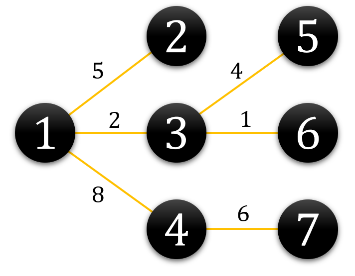 1번에서 각 노드까지 길이의 총합은 각 노드로의 길이를 더하면 되지만,