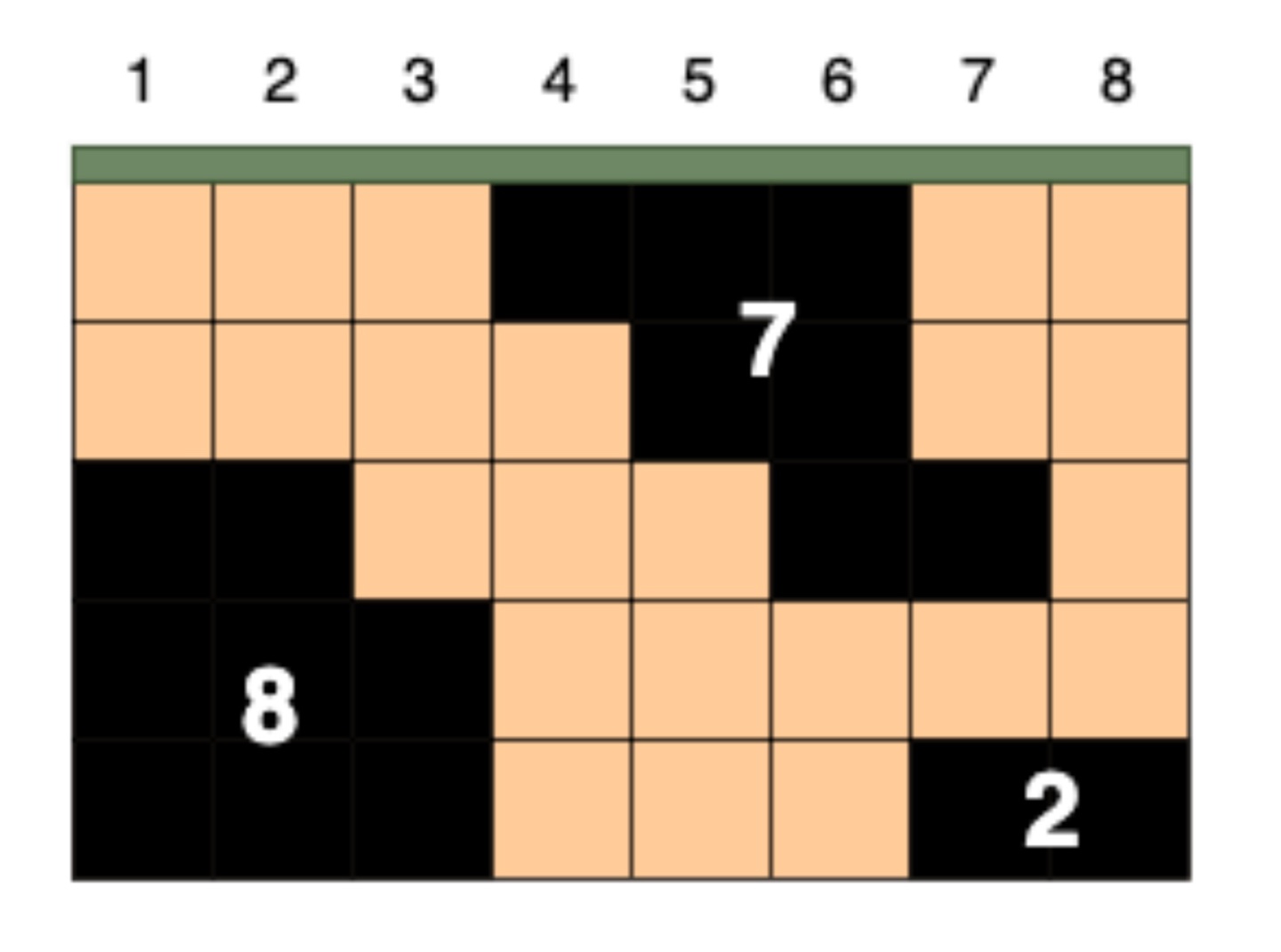 오른쪽 그림의 2번 열에서 시추관을 꽂았을 때, 왼쪽 출력처럼 처음 닿게 되는 위치가 (2, 0) 위치를 가리키기 때문에