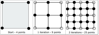 [그림]은 0단계(start)에서 2단계(2 iterations)까지 수행한 결과이다. 각 단계(N)가 계속해서 커져갈수록 점의 수가 커져간다.